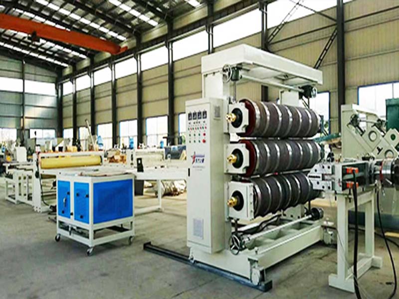 該設(shè)備采用SJ120或SJ-150單螺桿擠出機(jī)、T型彈性??诳烧{(diào)模具、立式或斜45度三輥壓光機(jī)、三合一水溫機(jī)、不銹鋼冷卻托架裝并裝有寬幅可調(diào)切邊刀、橡膠輥牽引機(jī)、雙工位氣漲軸收卷機(jī)。